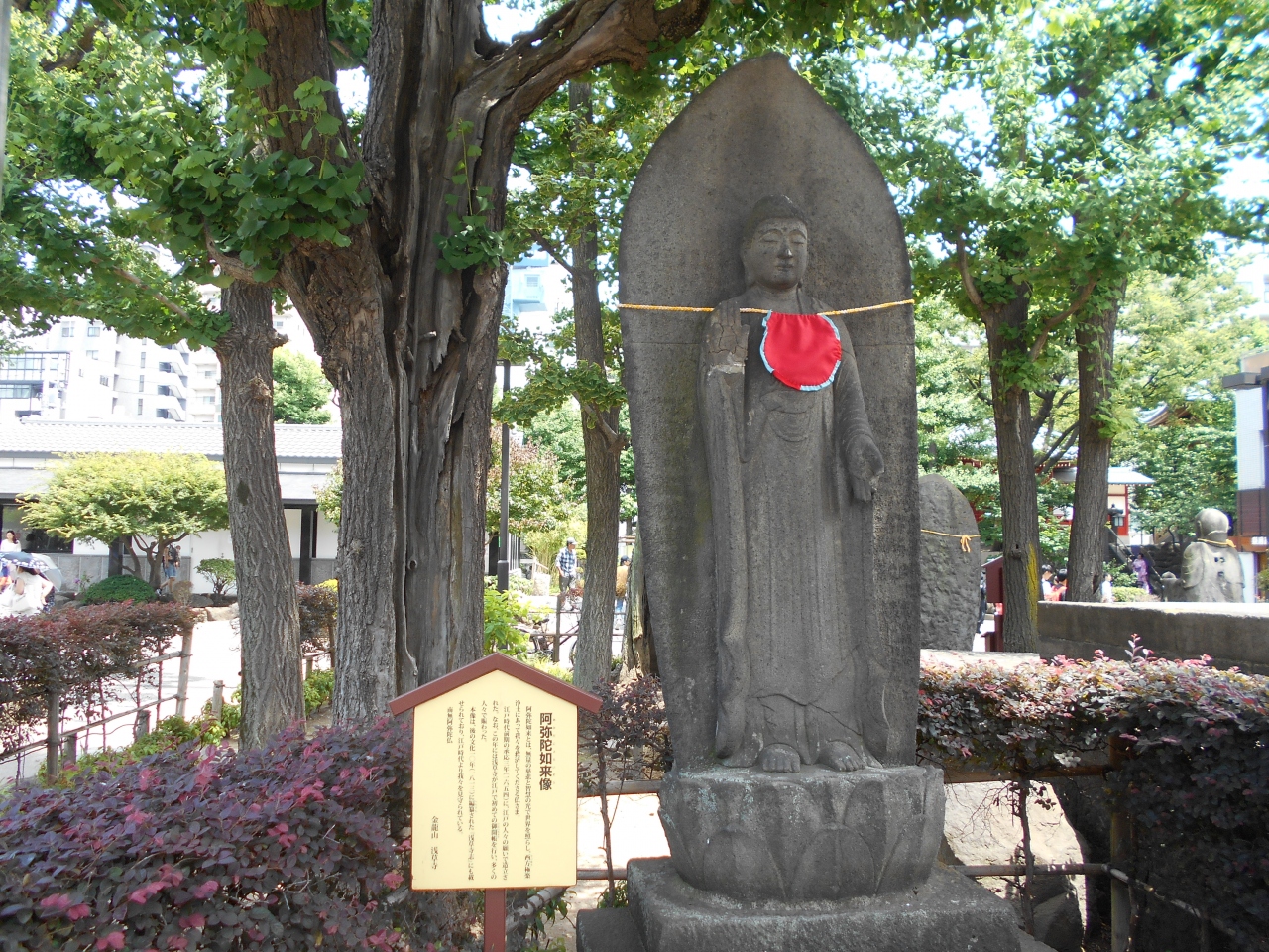 都内最古の寺”浅草寺”宝蔵門前の二尊仏の後側にひっそりと建つ小さな阿弥陀如来像。裏地蔵と言われる地蔵菩薩像と並んで建っています。裏側で寂しさが漂いますがここもご利益がありそうです。こちら側からは二尊仏の後ろ姿が眺められます。