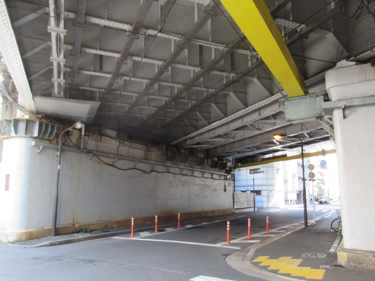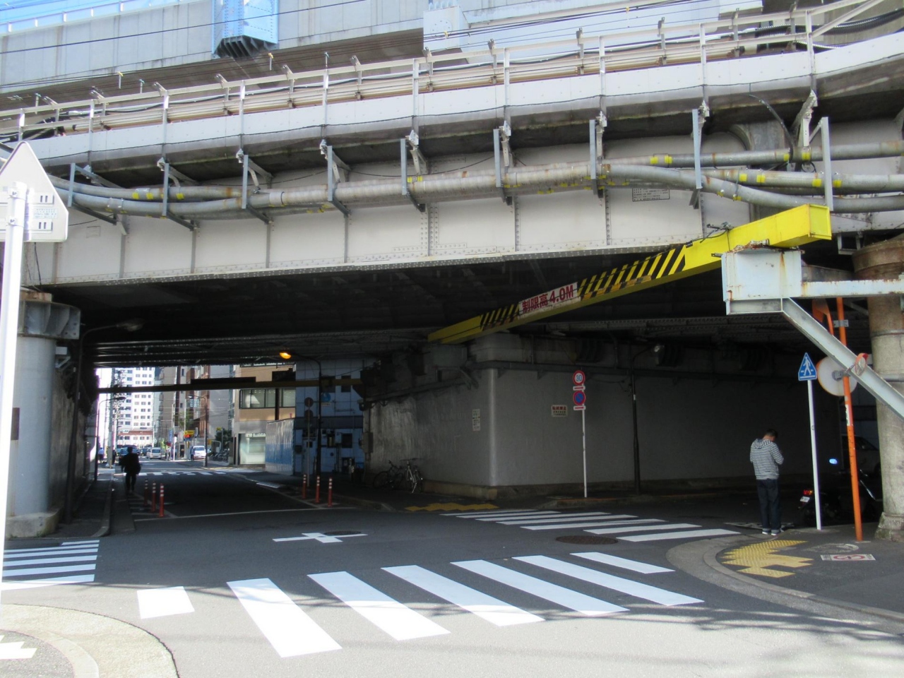 架道橋が架かっている二つの道路の幅は、広くないので途中に支柱はないが、道路に斜めに架かっているので架道橋の幅が結構広くガード下が薄暗くなっています。