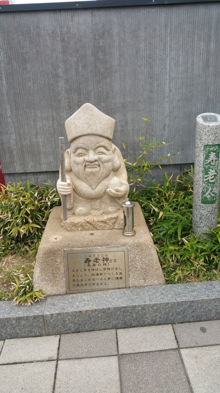 湯元の広場から東へ行った突き当たりの総湯に寿老人がいます。像の下にちょっとしたここですべきアドバイスが書かれていておもしろいです。像の横にある御影石のポールのうえに七福神の型があります。ポールに鎖で小さい円盤が繋がれていて何なのかわかりませんでした。後でわかったのですが、型に紙をあてて円盤でこすると紙に型が写り、スタンプラリーのようにするものだったようです。