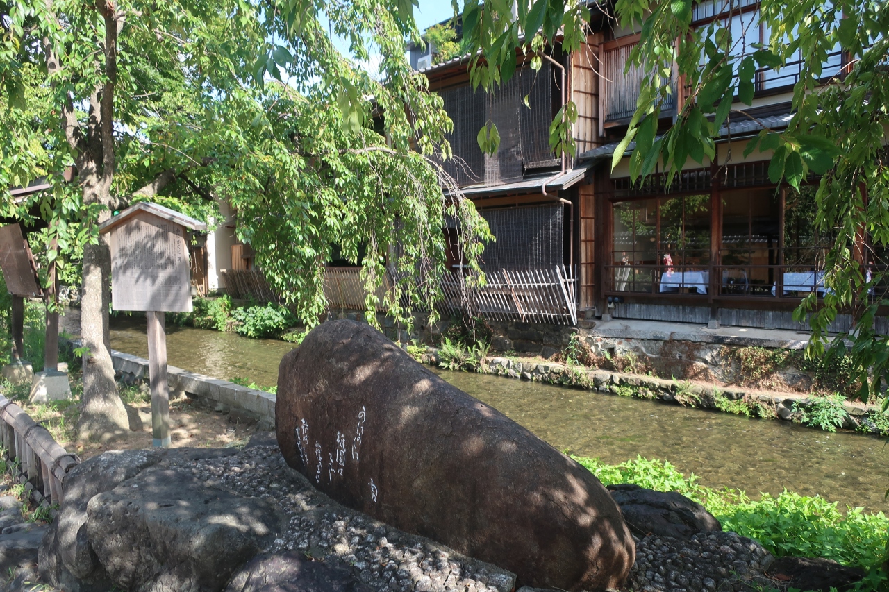巽橋近くの祇園白川沿い北側に「かにかくに碑」があります。石碑には「かにかくに 祇園はこひし 寐るときも 枕のしたを 水のながるる」と詠まれています。この碑のある祇園白川の北側にも明治期には茶屋があり、茶屋大友に出入りしていた吉井勇、谷崎潤一郎らによってこの碑が建立されました。