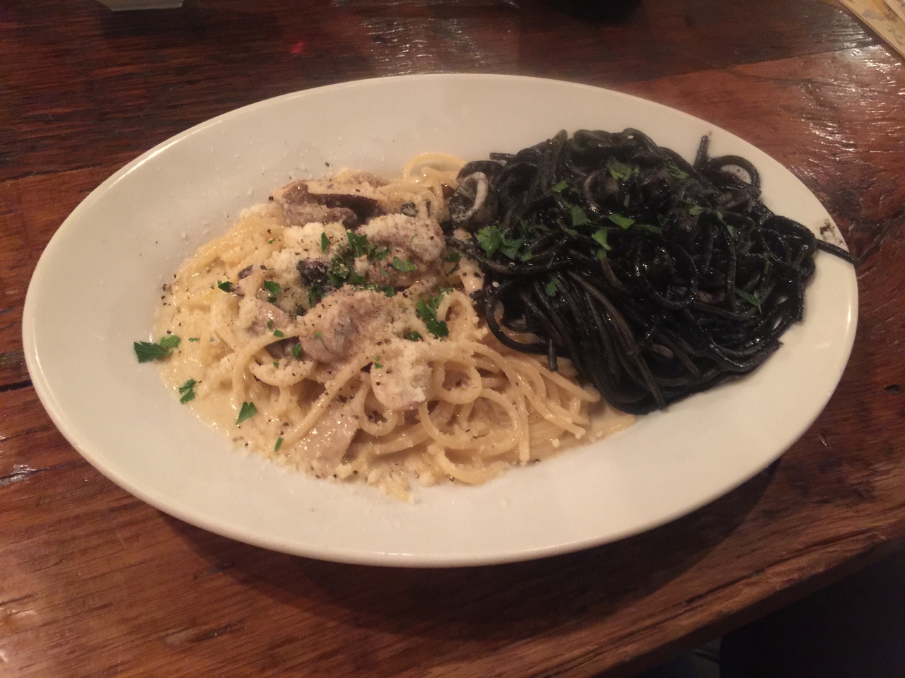 ゴルゴンゾーラクリームとイカ墨のダブルスパゲッティを赤ワインで!