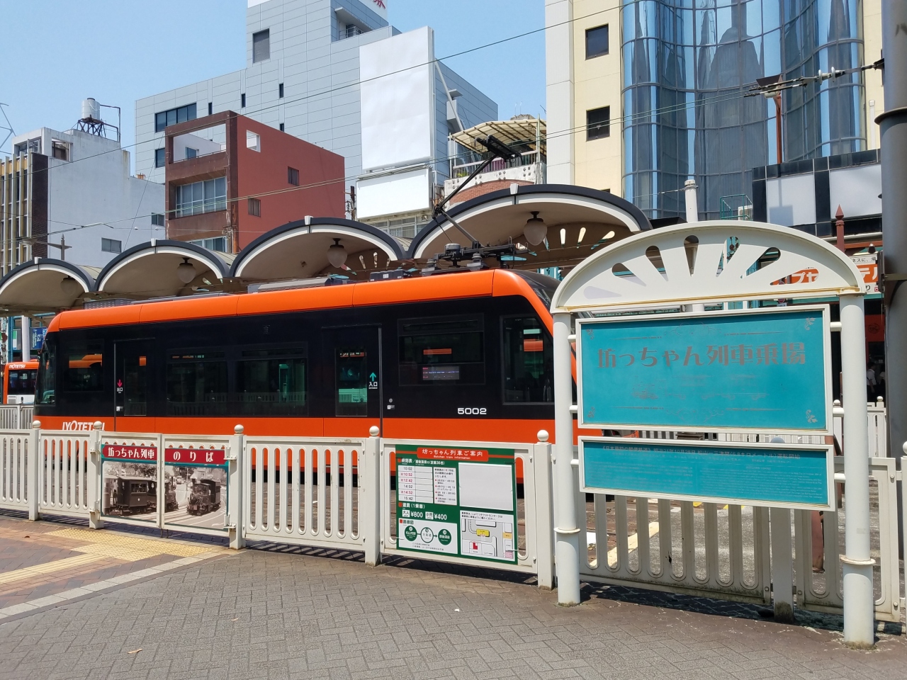 松山市街を散策していると、オレンジ色をはじめ様々なカラーリングの路面電車に混じり、ミニSLも走っています。松山市駅から道後温泉の間を走る観光列車で料金は特別料金です。時間が合わず乗車出来ませんでしたが、可愛らしい箱形の車両が走る姿は松山の街に合っていました。