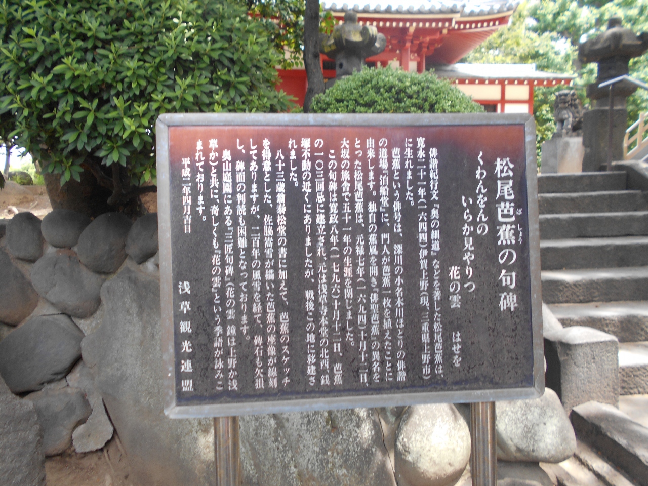 都内最古の寺”浅草寺”の境内右側の弁天堂の前に建つ芭蕉の句碑。境内には多くの石碑が建っていますが句碑は弁天堂が建つ弁天山の木々に囲まれて静かに建っています。大きな石に刻まれた文字は年月が経ち薄れて見ずらくなっていますが横に由緒版が建ち良くわかります。全国を旅した芭蕉ならではの句碑ですね。