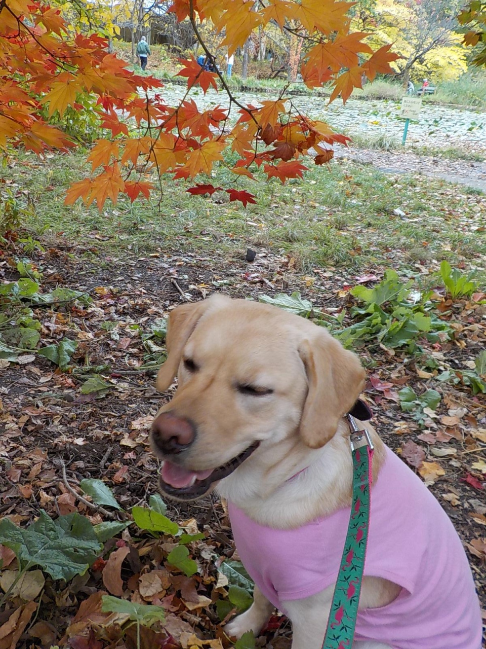 池をバックに写真