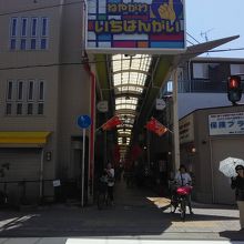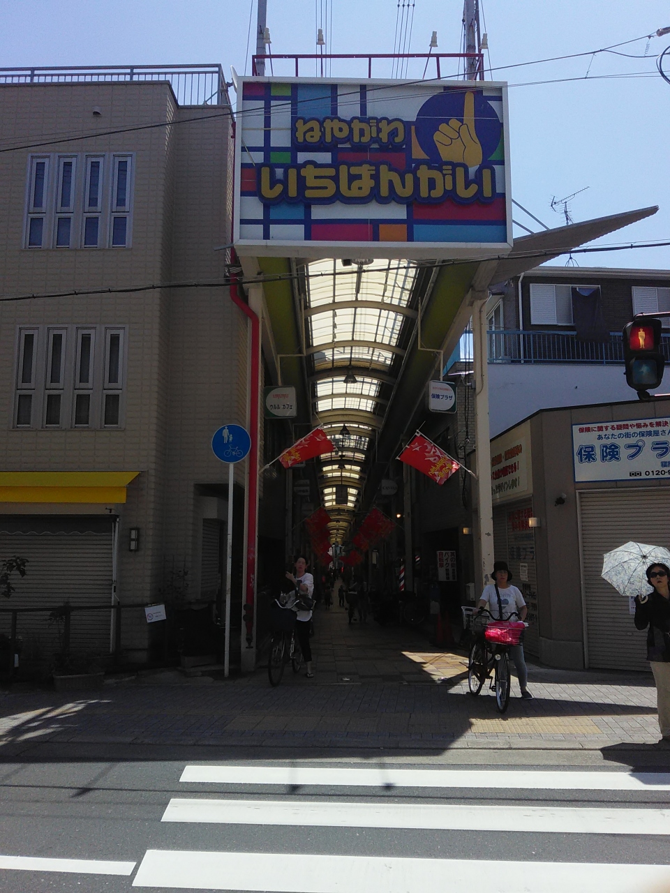 寝屋川市駅のホームから見えるイズミヤがある方に降りて、大阪方面よりにある商店街、すアーケードがあって、ひときわ目立つ看板があります。昼くらいに行ったのですが、人通りは少なく、パチンコ屋は栄えていましたが、商店自体は、のんびりとした雰囲気でした。線路挟んで向かい側に、ベル大利商店があり そちらの方が私が行った時には栄えていました。