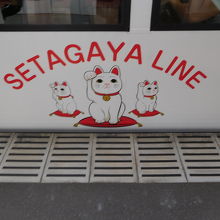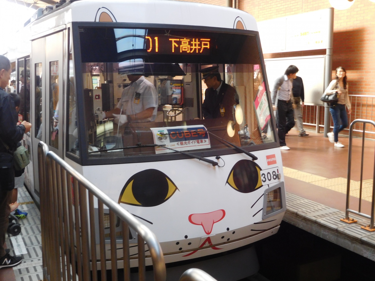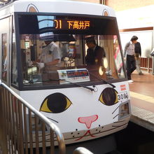 三軒茶屋駅と下高井戸駅間を2両編成の電車で走る、とてもローカル感のある路線です。世田谷線50周年記念で復活した、新「幸福の招き猫電車」に乗車した所、ちょうど観光ガイド電車で運行していたので、沿線の耳寄りな情報なども聞けて、とても良かったです。途中駅から乗車する際は、先頭か一番後ろ側からの乗車となり、降りる際は、ICカードのタッチは不要でした。車内のつり革がまねき猫の手だったり、床にはネコの足跡が描かれていたり、とても特別感があって、楽しめました。