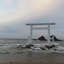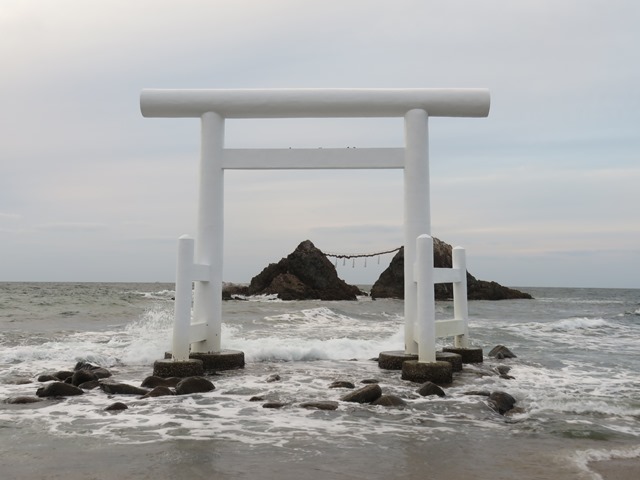 志摩サンセットロードから見えるしめ縄で結ばれた夫婦岩と白い鳥居がシンボル