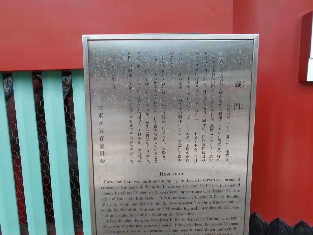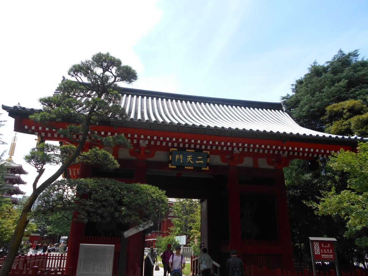 浅草寺の東に建つ鮮やかな朱塗りの門で慶安2年(1649)に浅草寺東門として創建。門の左右に広目天と持国天の二天像を祀ることで二天門と呼ばれます。今は天目天は焼失して左は増長天が奉安されています。江戸初期の建築物として国の重要文化財に指定されています。美しい姿の門で人通りも少ないです是非門をくぐって外側から眺めくください。