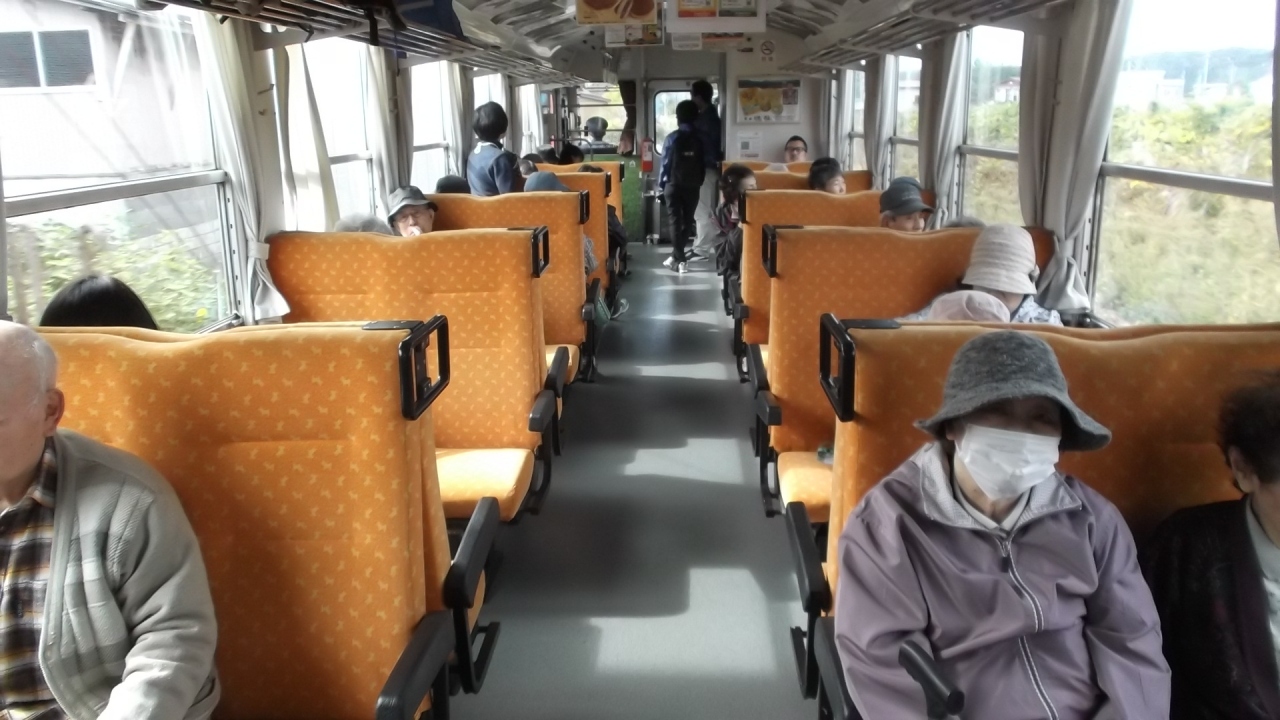 鷹巣駅~角館駅間乗車(1700円)。スラフルなボディペイントの1両編成(4人掛けボックス席)で山間部を走る列車は紅葉絶景を楽しませてくれる。
