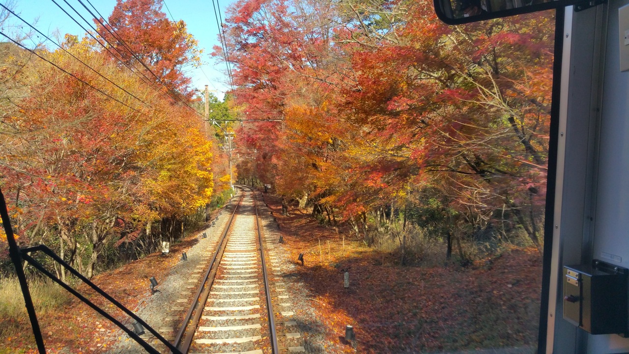 紅葉の季節、大人気の観光電車の「きらら」。天上にもかかる大きな窓の電車で、窓向きの座席もあります。紅葉のトンネルでは速度を落として走行してくれます。時間が合わなくてきららに乗れない場合も前頭車両の一番前に立てば紅葉のトンネルを満喫できます。