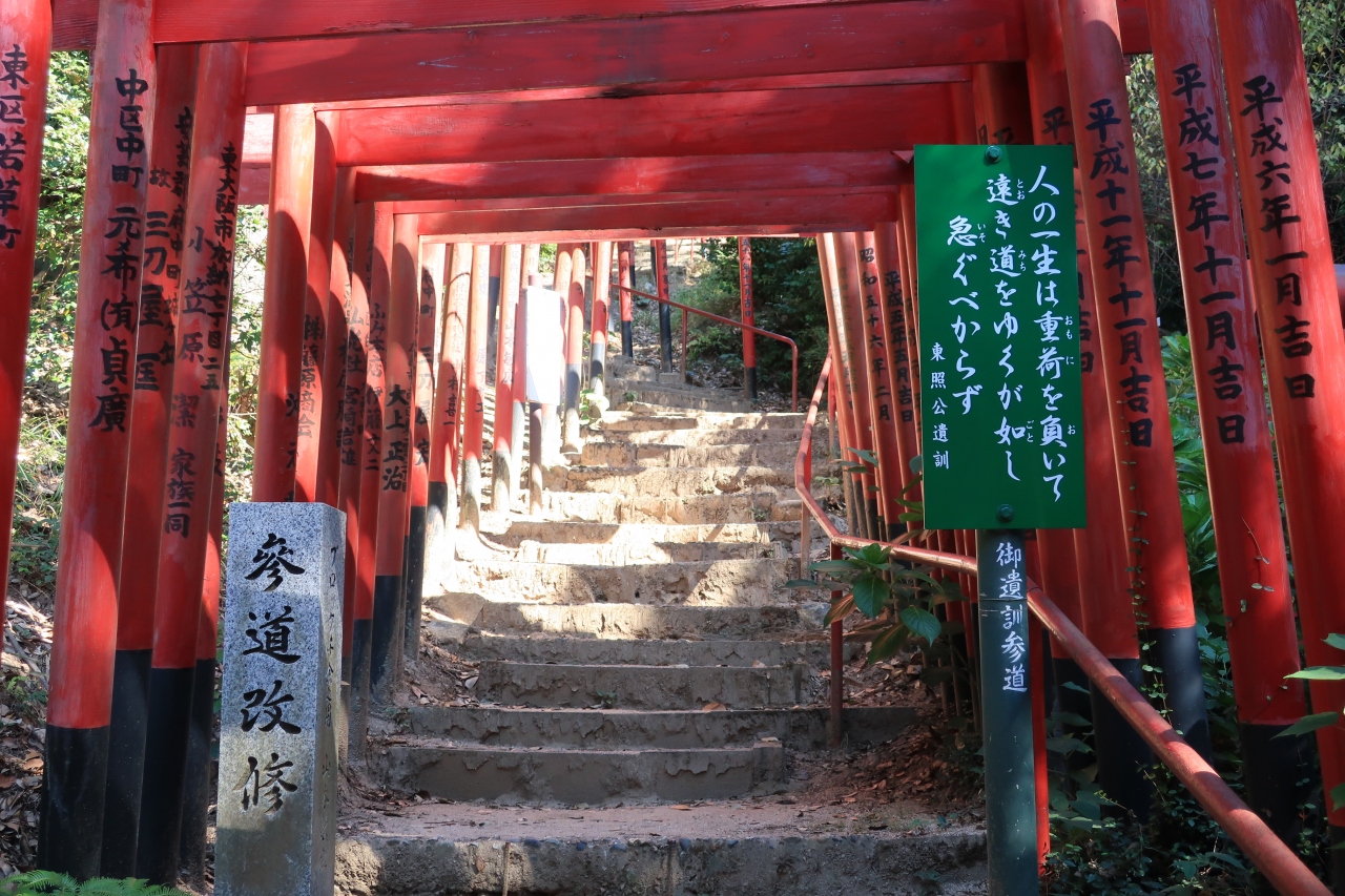 広島東照宮の摂社で、鳥居は東照宮の参道に、本堂は東照宮の「裏山」にある。元禄のころから東照宮の摂社として参拝されてきたというから、商売繁盛・家内安全・諸願成就の神様として東照宮の参拝客から人気を集めたのだろう。本殿手前から奥宮の参道が伸びているが、入り口には家康の遺訓「人の一生は重荷を背負いて…」が掲げてあり、参道の険しい道のりを想像させた。