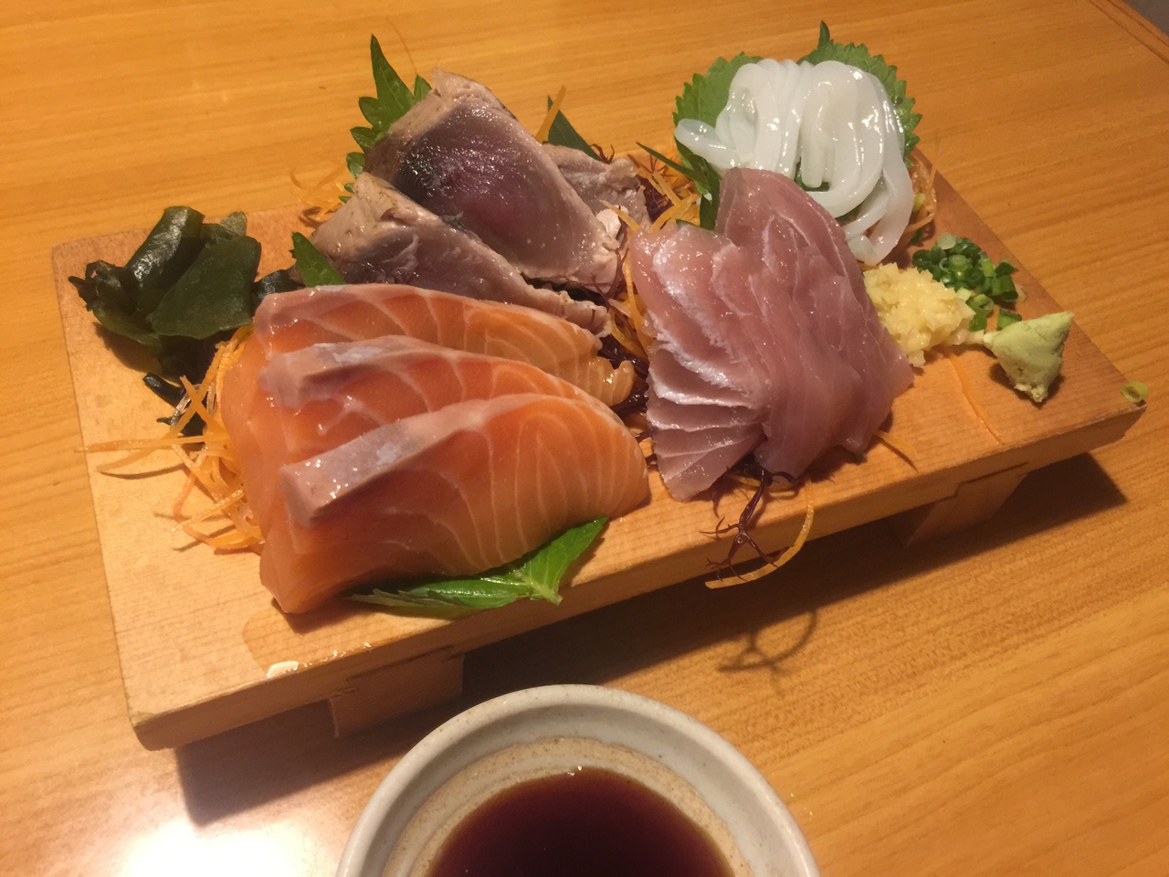 飲み放題にしましたよ。先ずは生ビール!野菜盛りと刺身盛りをたのみました。刺身はまぐろ、かつお、サーモン、イカ!日本酒が進みました!
