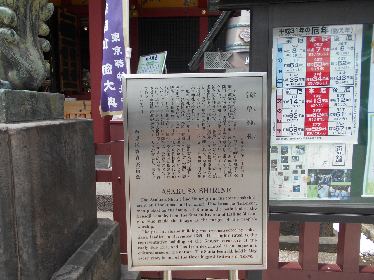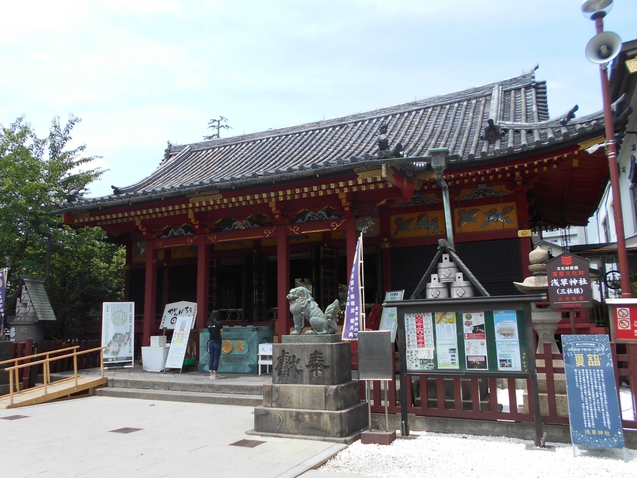 浅草寺本堂の右側で二天門の間に鎮座する神社。土師真中知、槙前浜成、檜前竹成の三神を主祭神として東照宮を合祀しているので三社権現と称されています。明治の神仏分離により浅草寺と別になり明治6年に浅草神社に改称されたそうです。境内には関連する有名人のいろいろな碑があり面白いです。拝殿・幣殿・本殿は国の重要文化財に指定されています。