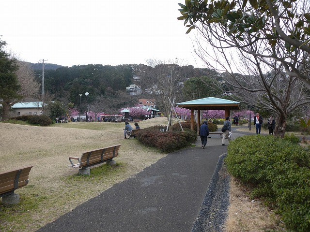 2月から3月にかけて、早咲きのピンクの桜が満喫ができる河津桜。桜並木のほぼ真ん中あたりにあるのが笹原公園です。そう大きくはない地元の公園ですが、足湯がつくられており、トイレやお土産売り場などもあるなど、観光客の休憩所になってました。観光マップなどもこちらでもらいました。