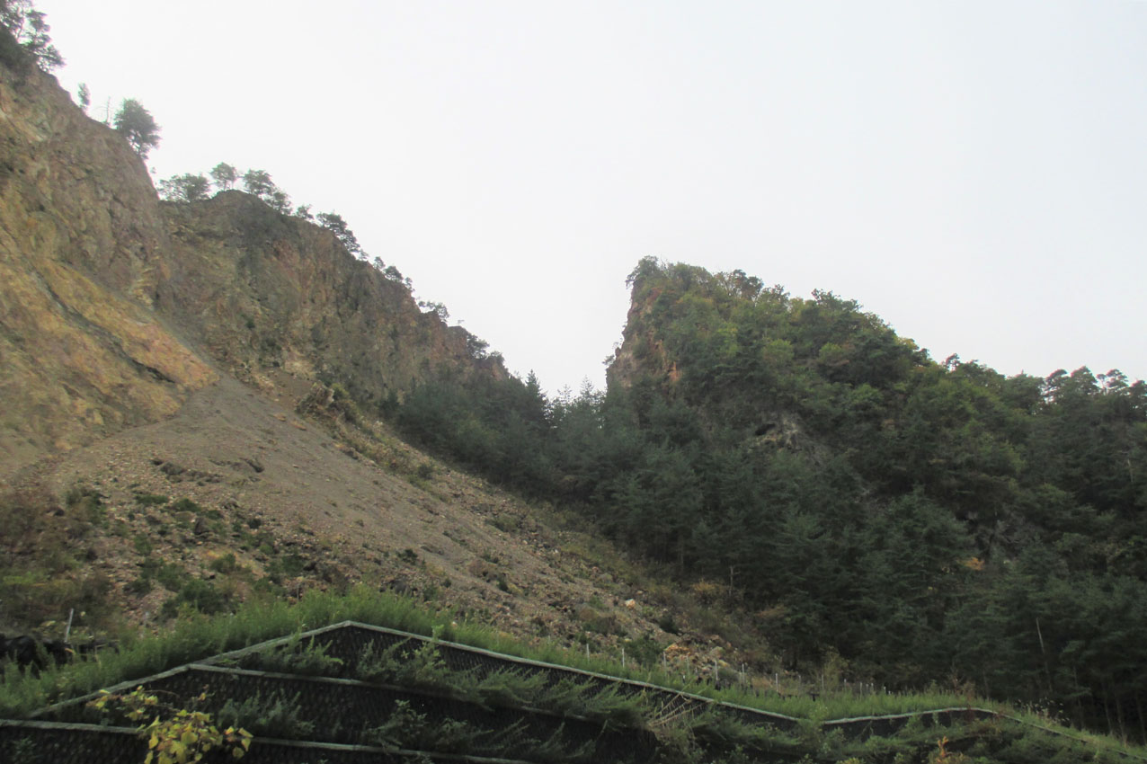 佐渡金山の道遊坑コースを歩き、表に出たところで道遊の割戸方向を見たら、すっかりガスに煙ってしまっていました。そこで別の日に大佐渡スカイライン上から道遊の割戸を見ました。こちらは良く写真などで見る姿とは違い、裏側からの眺めです。ちょっと荒々しい感じがしました。