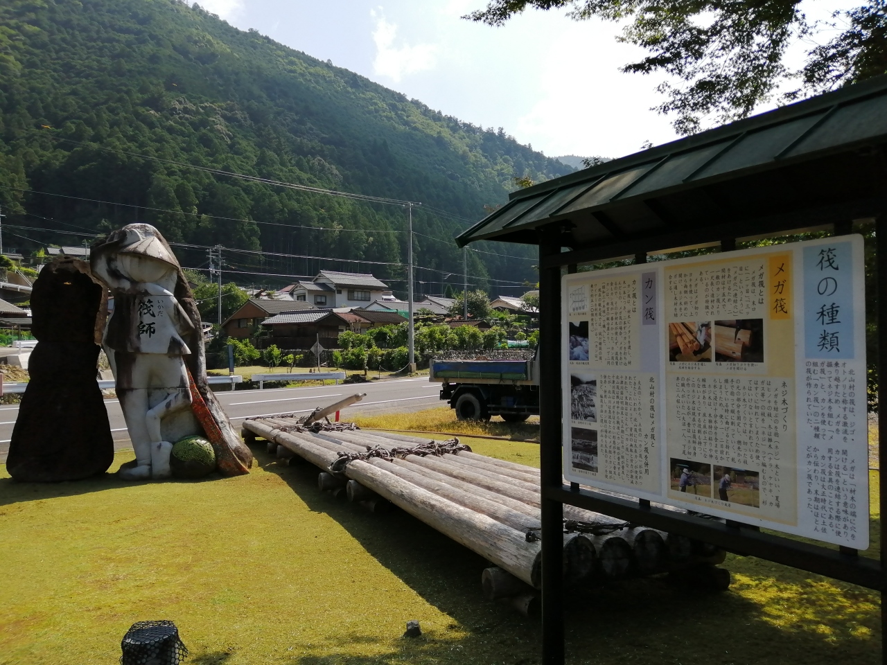 駐車場の一角に、材木流しの筏の展示がありました。