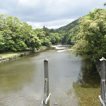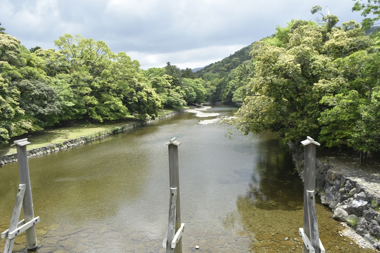 内宮の参拝は、宇治橋手前の大鳥居をくぐりこの宇治橋を渡ることで始まります。この橋を渡ることで身が引き締まる思いもしますが、内宮の本殿まではこれからまだまだです。宇治橋の下を流れる川が、五十鈴川(別名御裳裾川)です。普段は、透明度の高い川です。