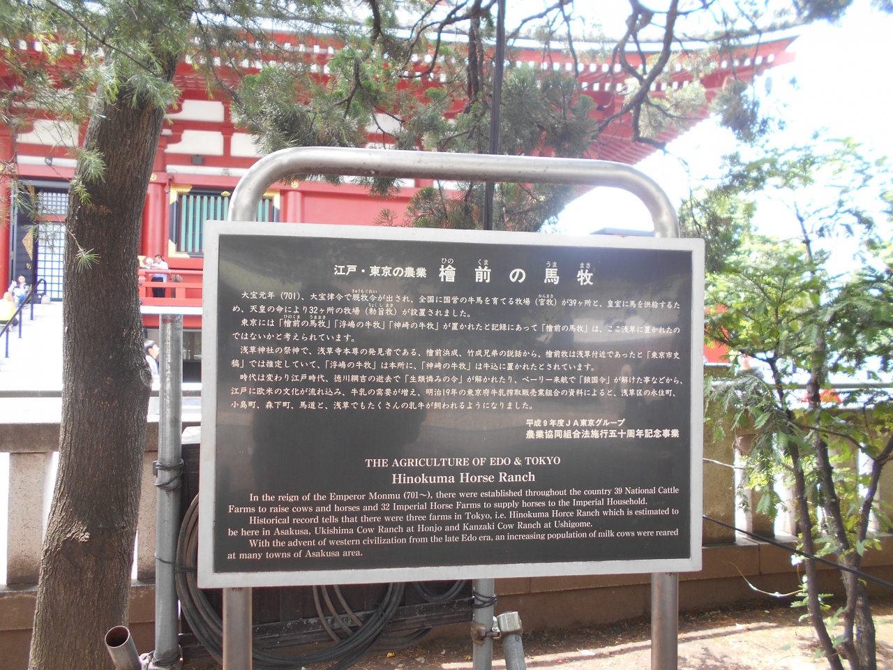浅草神社の境内左側の林に建つ由緒版。大宝元年(701)大宝律令で厩牧令が出され全国に国営の牛馬の牧場が設置され東京の一つが「檜前の馬牧」でここ浅草神社の境内にあったのではないかと考えられているそうです。大宝の時代から牛馬は貴重な動物だったようですね。