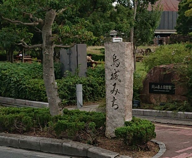 岡山城に向かうのにこちらの道を通りました。岡山県立図書館前に「烏城みち」と記された石製の標柱がありました。調べたら「城下交差点から市民会館前を通り岡山城入口を通り県庁前まで」だそうです。曜日や時間帯にもよるでしょうが、週末の午後は車通りはそれほど多くはなかったですし、人通りも多くはありませんでした。歩道は広く歩きやすかったです。
