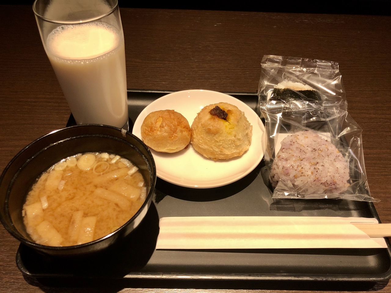 違いは、おにぎり、パン、味噌汁、スープが提供されています。
