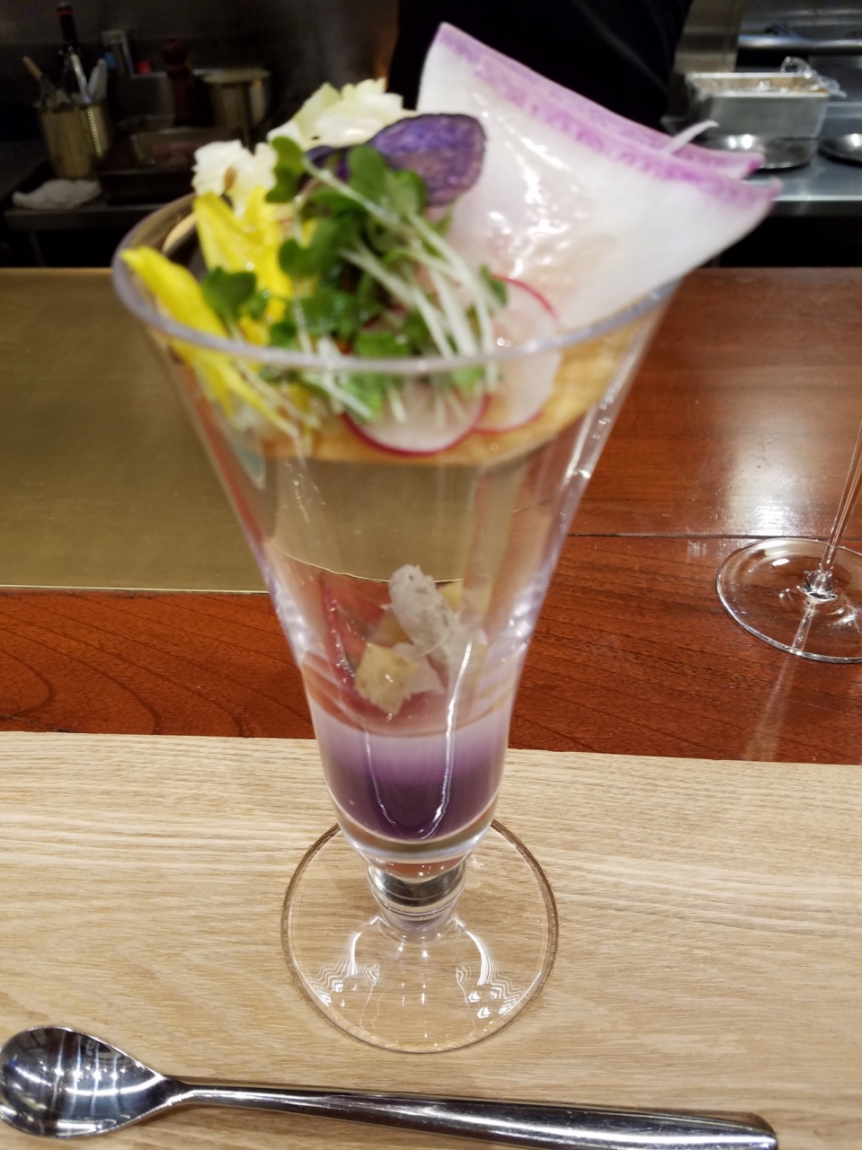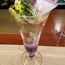 銀座ベルビア館の8階にあります。テーブル席とカウンター席がありますが、カウンター席を選びました。ここではシェフが肉を炭火で焼いている様子が見られます。ここのもう1つの楽しみは季節の野菜パフェです。グラスの容器に入り混ぜながら食べます。見た目もかわいく。味もおいしい。パンもキューブ型をしているフォカッチャです。前菜、パスタなどは量は少し少なめかな。ワンドリンク付きでフルコースで4400円。ちょっと高い。