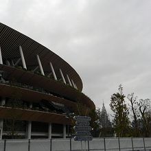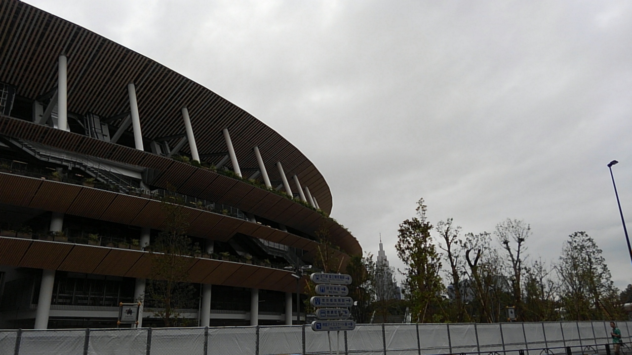 今回初めて行ってきました新国立競技場です。お天気の日だったので、信濃町駅からブラブラと歩いていくことになりまして。全体像を見るともうすぐ完成という感じです。競技場前の案内板もありました。すぐ近くにオリンピックミュージアムもあります。