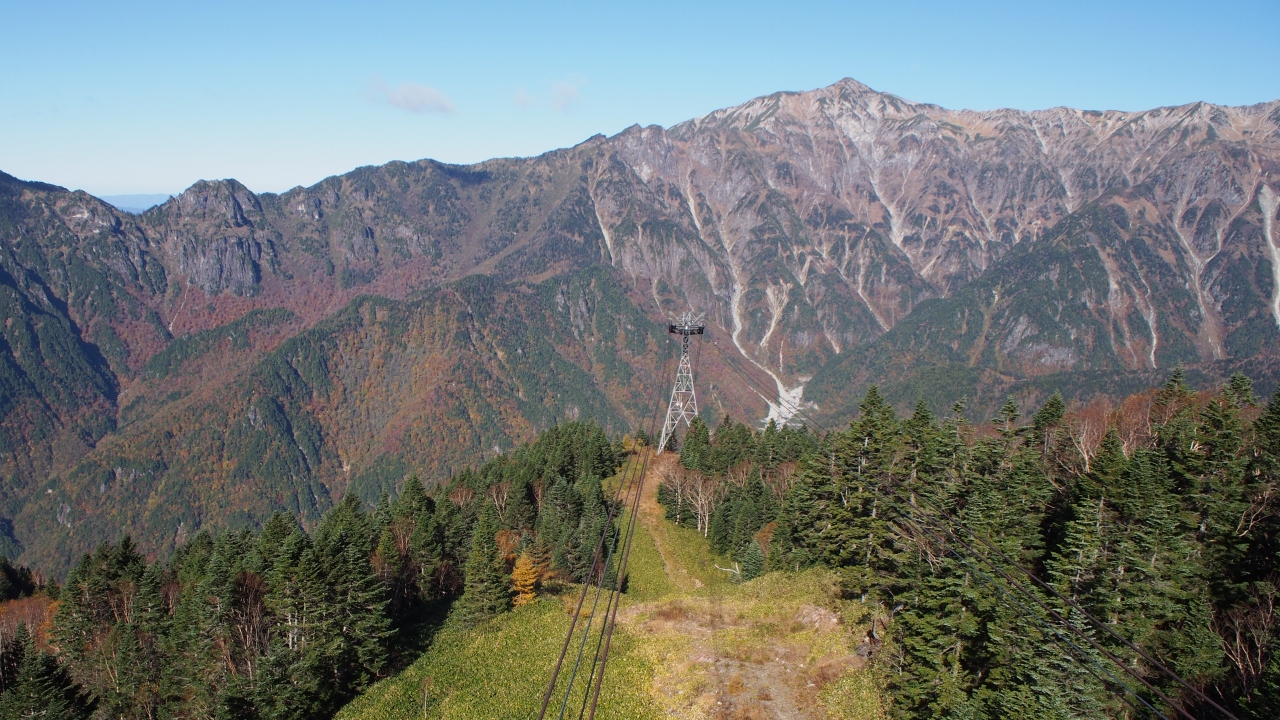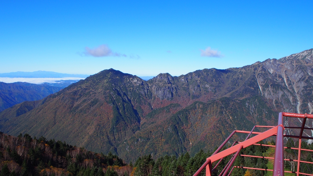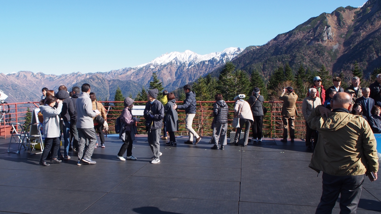 このロープウェイは2階建てになっており、約100名乗れるそうである。頂上までの景観も素晴らしく遠くまで見渡せる。頂上の展望台の景観も素晴らしく穂高連峰は言うまでもなく遠くは石川県の白山まで見渡せる。素晴らしいの一言である。