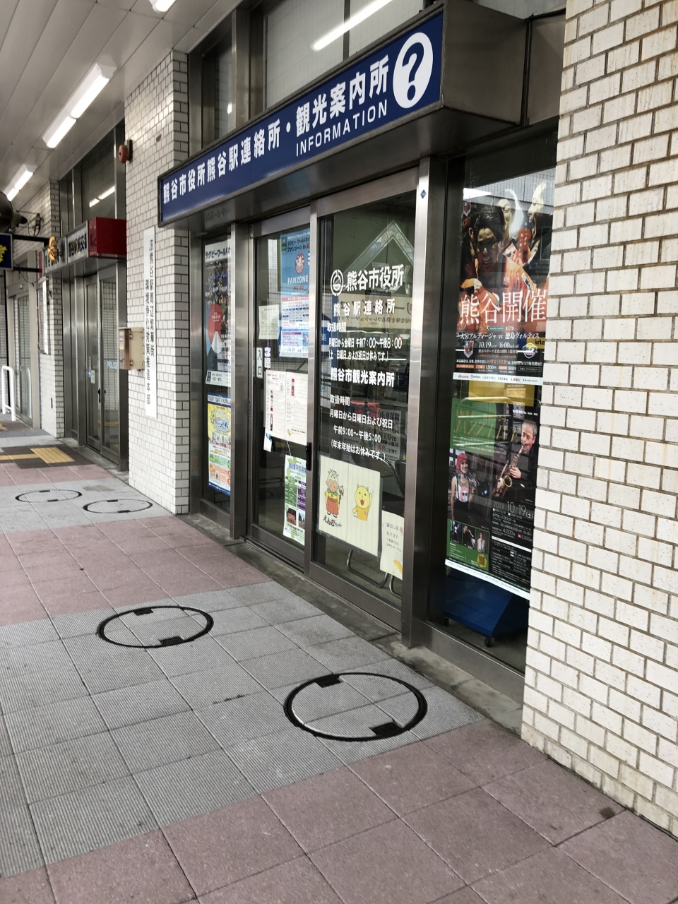 JR熊谷駅の一階にあります。北口のエスカレーター(階段)を降りて右側に行くとあります。看板はピンク色から紺色に変わっていました。熊谷市の観光地図やパンフレットをもらい、バスの停留所など、とても親切に教えていただきました。