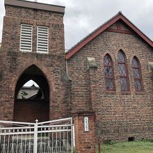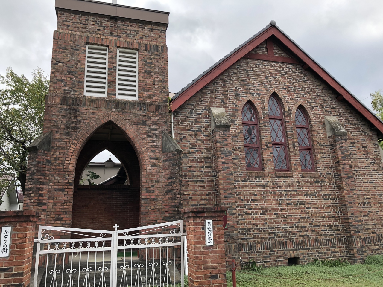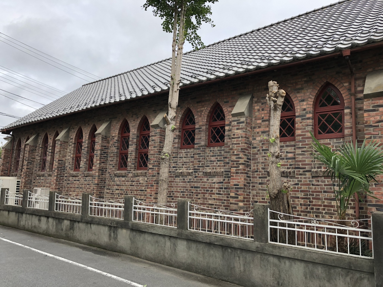 煉瓦造りの瀟洒な建物の教会ですが、塔の高さが少し低いような気がしました。煉瓦の色が一色ではなく、色々な色が混ざり合っているので、壁面が変化に富んでいるのが特徴的。門も建物とともに登録有形文化財に指定されていました。