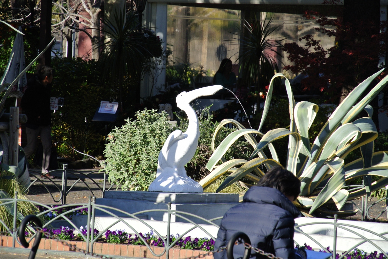 噴水といっても、ペリカンのくちばしから水がぴゅーっと出ているものですが、とてもかわいらしくてなごみます。遊楽門から入ってまっすぐ行くと見えてくるのでわかりやすいです。第一花壇の東端っこにあり、記念撮影にもよいかと思います。