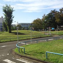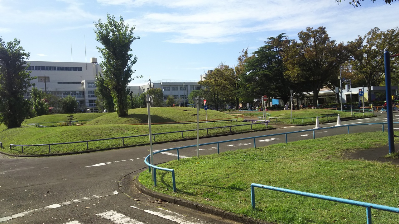 羽田近くの萩中という地域にある公園です。芝生エリアもありますが、遊び甲斐がありそうな遊具や自転車を走行させることができる本物の道路さながらのコースがあって、自由に走らせることができます。
