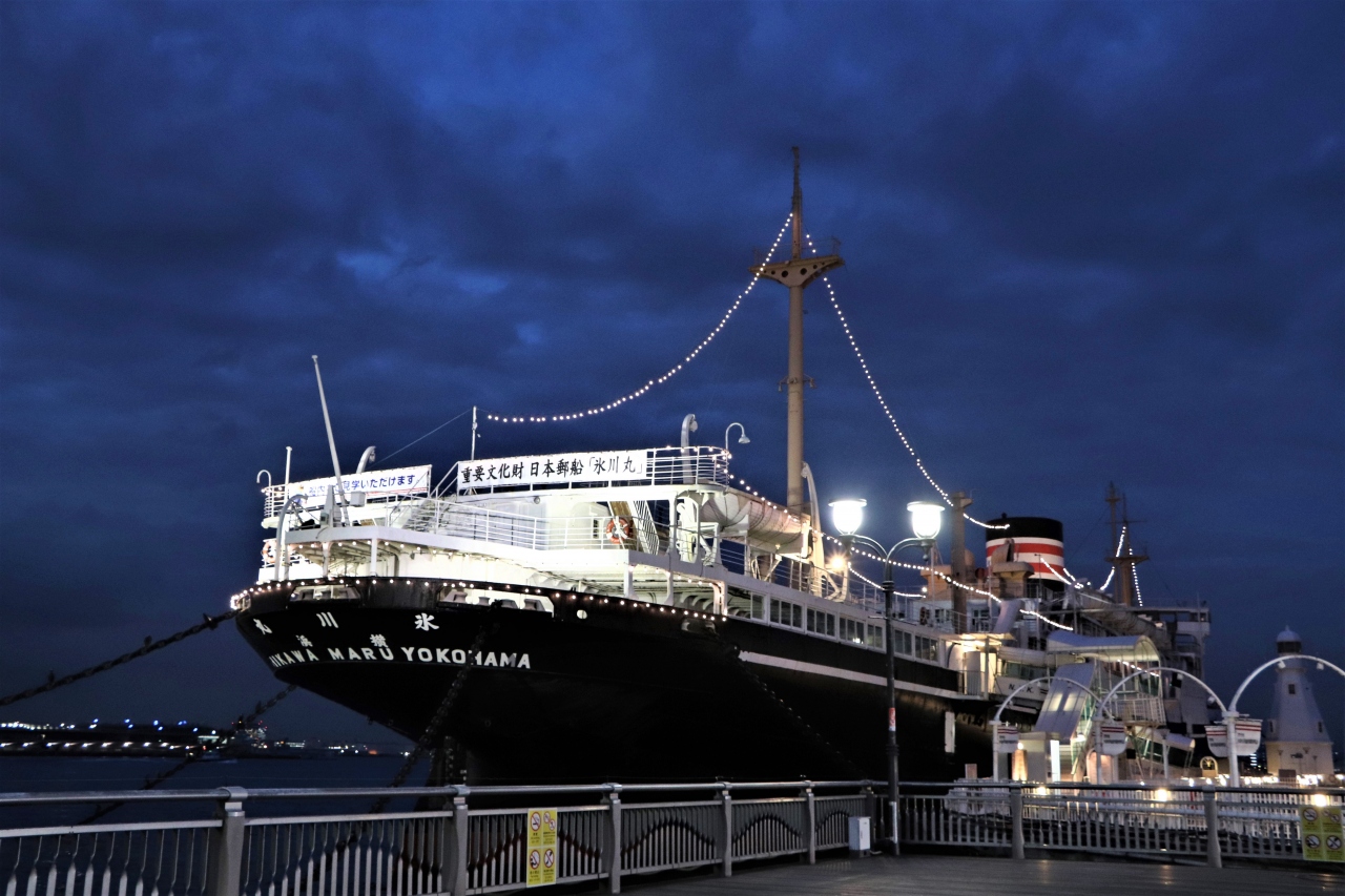 暗闇の中に浮かび上がる氷川丸は昼間とは異なる美しさです