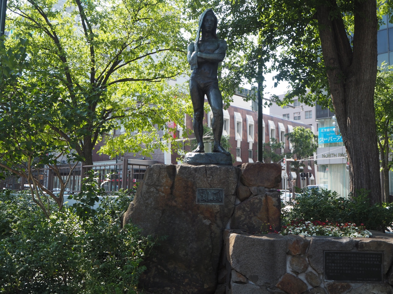 「湖風の像」は札幌の大通公園の3丁目にある像です。地下鉄東西線の開通と北洋相互銀行の本店ビルの建設を記念して、銀行より寄贈された像です。街の発展や銀行の繁栄などを祈って造られた像と思われます。湖風の像はそのためか若々しい青年の像です。湖風という題名が付いているので、頭に架かっている布は風に吹かれているのを表しているのでしょうか。