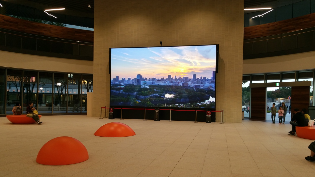 1階のロビーには誰でも入れるようになっていて、大きなモニター画面(このときはliveカメラで大阪城周辺を映していました)と変わったら形のベンチが点在していて休憩ができます。すみっこにはカフェもありました。外には名探偵コナンファミリー?の像があり写真スポットになっています。