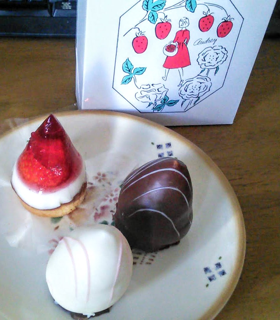 苺はそのまま生で食べるのが一番おいしいと思っているので、並ぶ必要のない生菓子から、パウンド生地+ミルクゼリーの上に苺をのせたルビーと、サクサクの丸いクッキーの上に生クリームで包んだ苺をのせ、チョコレートでコーティングしたロンシャンティを購入しました。中に入っている苺は、すずあかね、サマープリンセス、そして店名を冠したオードリー苺で、一般に食べる機会のない品種の苺を食べ比べできます。さわやかな酸味の苺そのものをおいしく食べるためのお菓子といった感じでした。