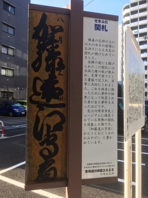 東海道の宿場には「江戸方」と「京方」の二つの入口があります。こちらは京都寄りの京方です。こちらの見どころは関札のレプリカです。今のように通信手段のない江戸時代ですが、大名同士の鉢合わせはどうしても避けたいもの。宿場の入口を棒鼻といった形状にするのもその手段の一つですが、やはり関札が最も効果的。どの大名が宿場入りしているか一目でわかります。