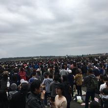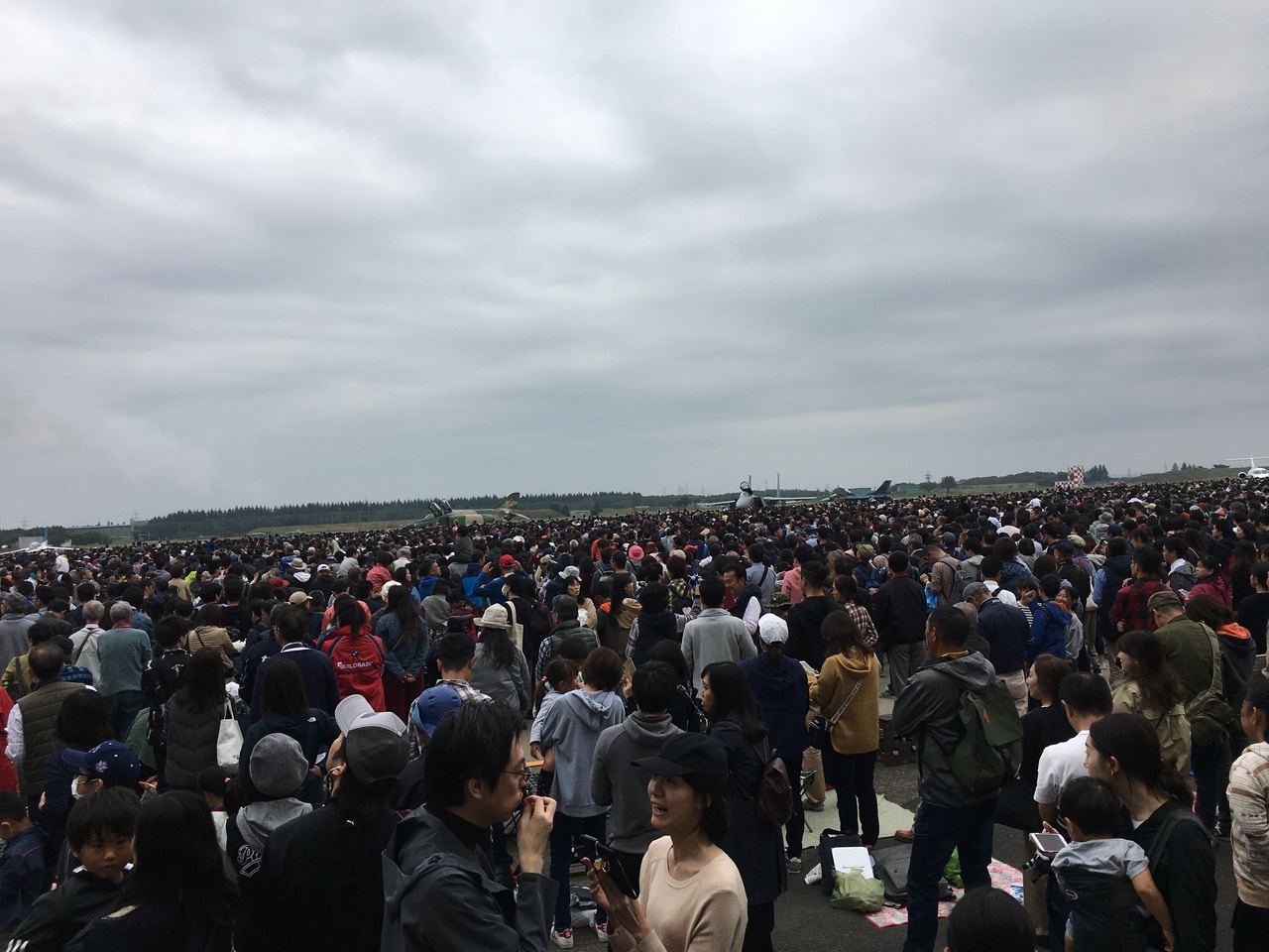 去年行きそこなったため満を持して現地に向かいました。当然ながら目的はブルーインパルスの展示飛行です。稲荷山公園駅の臨時改札を出るとそこはもう航空自衛隊の入間基地。大勢の観衆でごった返していました。ブルーインパルスは概ね十字方向に飛ぶため、飛行場と並行した展示飛行をカットすれば、真上を直進する臨時改札付近でも楽しめそうですが、あえて人の多い飛行場に向かい、横縦の飛行を見上げました。