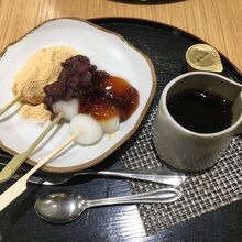 休日の買い物途中、お茶しました。メニューのディスプレイにお団子があるのに気がついてコーヒーとのセットを注文しました。お団子は きな粉、あんこ、しょう油だれの3 本で どれも美味しく頂く事が出来ました。コーヒーとも合っていると思います。