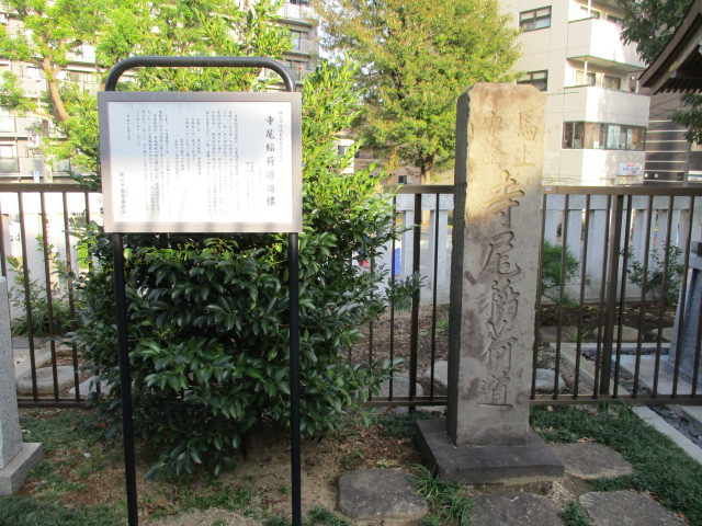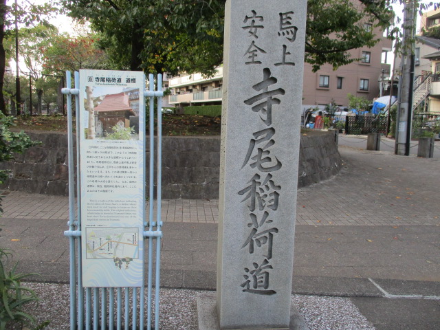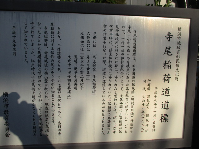 JR鶴見駅東口からJR線路沿いを川崎方向に進むと鶴見神社の境内にある寺尾稲荷道道標に歩いて10分ぐらいで着きます。寺尾稲荷道道標は1705年(寛永2年)に旧東海道の鶴見橋に立てられた寺尾稲荷への道標で江戸時代に馬術上達が叶えられる寺尾稲荷に参詣者が多かったのでたてられたそうです。現在は旧東海道沿い鶴見図書館前にもレプリカが立ってます。寺尾稲荷神社は現在は馬場稲荷神社になってます。歴史の勉強になりましたので訪れることをお勧めします。
