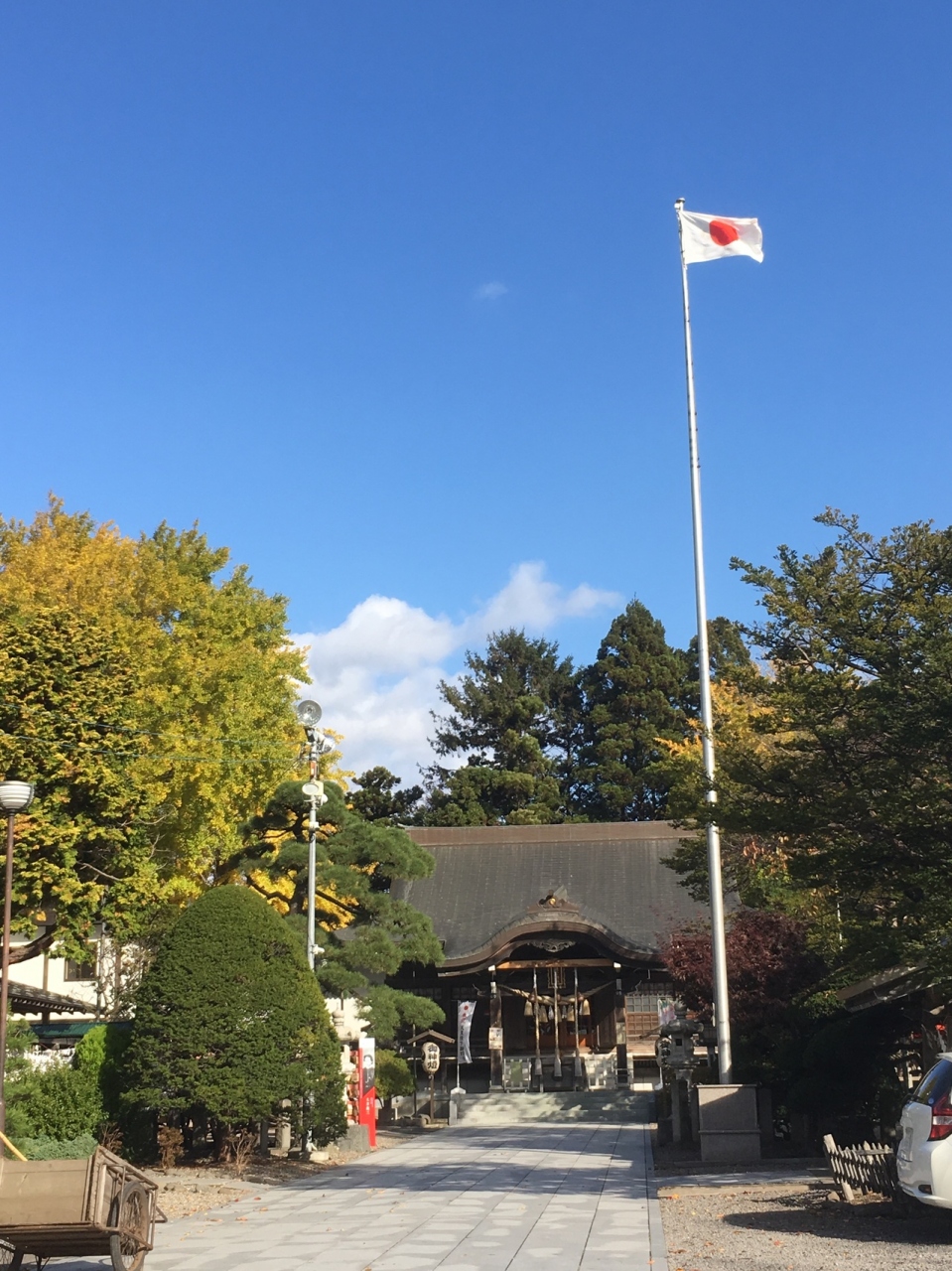湯の川温泉の足湯から歩いてほと近い場所にある神社。私が行った日は晴天だったので階段を上るときに青い空と日の丸が目に入りました。神社には大きなイチョウの木が植わっており、紅葉で鮮やかな黄色に色づいていたのがとても印象的なでした。