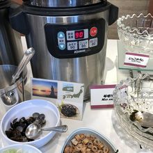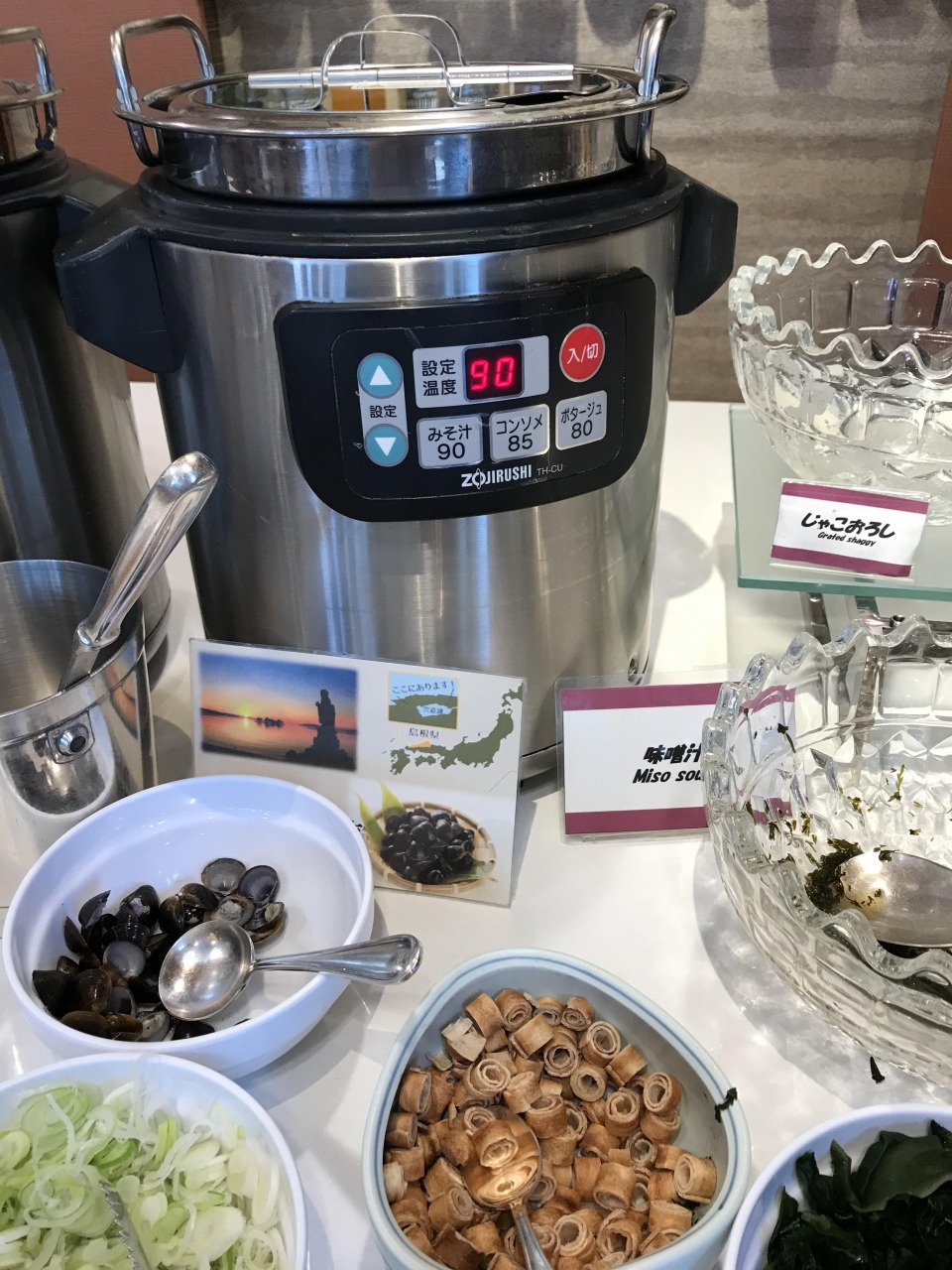 宿泊した際に朝食で利用しました。朝食はビュッフェ形式です。一般的な和洋食に加えて、シジミの佃煮や味噌汁をはじめとした地元の名物がありました。なかでも、地元の魚を焼き立てで提供してもらえたのが特に良かったです。「のどぐろ、れんこだい、さば」の3種がありました。