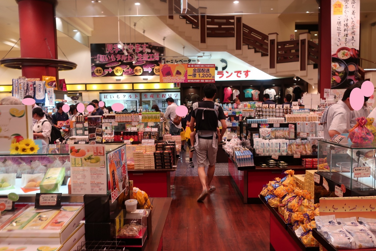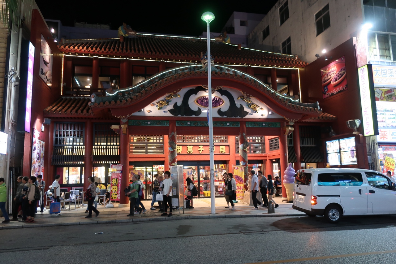 国際通りにある御菓子御殿です。外観が御殿そのものなのでとても目立ちます。大きなショップで、品揃えは豊富です。紅芋タルトの生産工程を見ることもできます。2階にはレストランがありました。夜に訪れましたが、観光客で混雑していました。