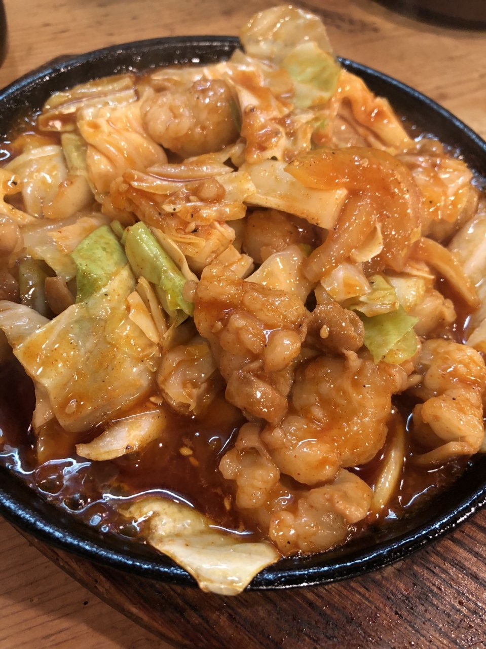オニオンスライスは無言だけど、味噌ホルモン炒めは鉄板の上でジュージュー言っている