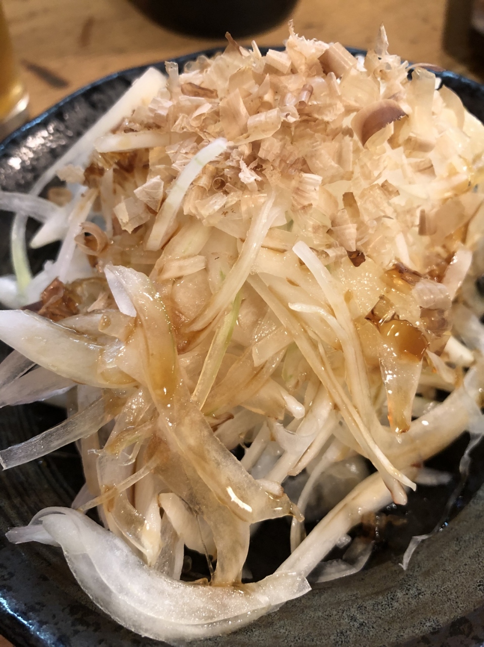 お通しを摘んで、ビールを飲んでいるところに、オニオンスライスが、続いて 味噌ホルモン炒めが届いた