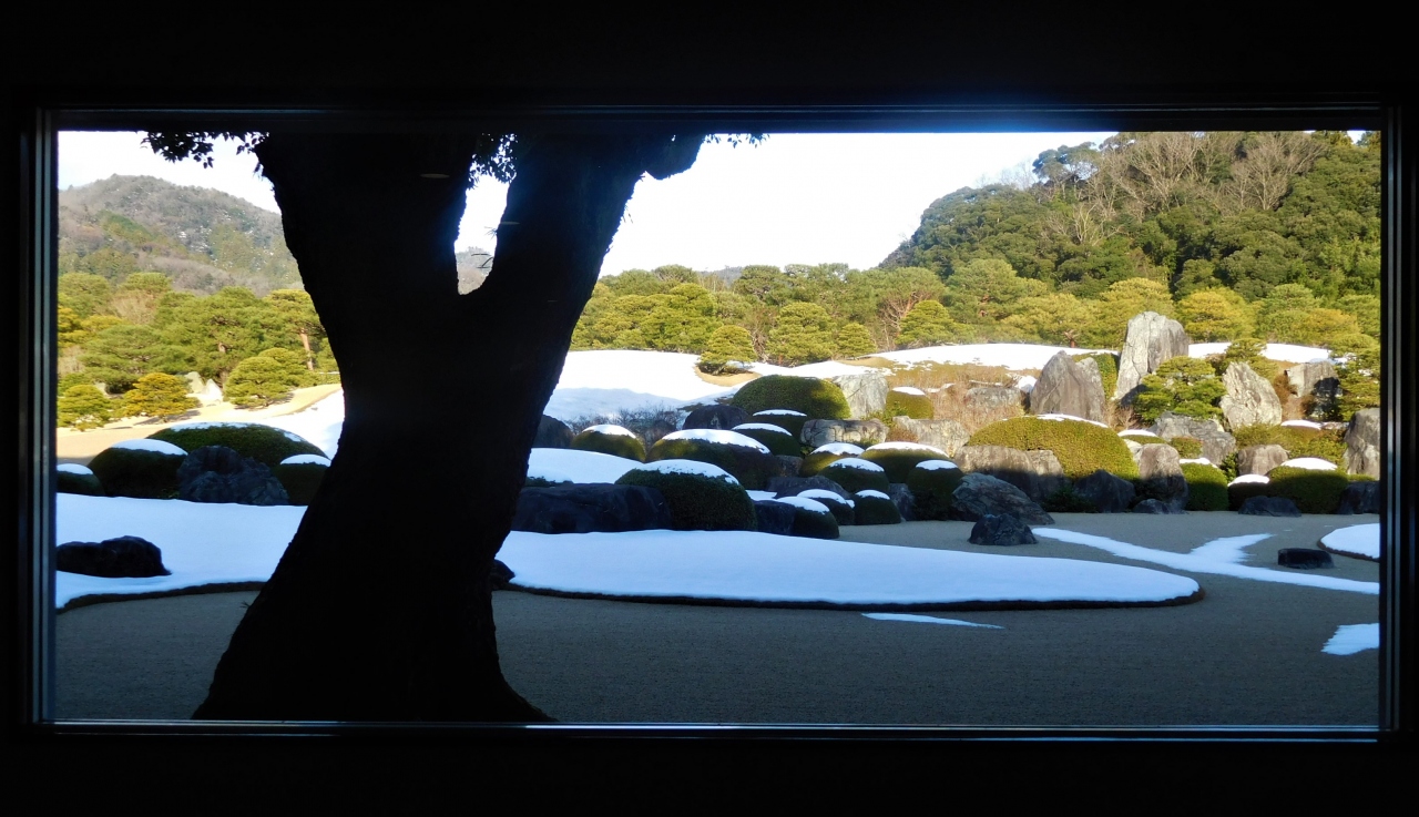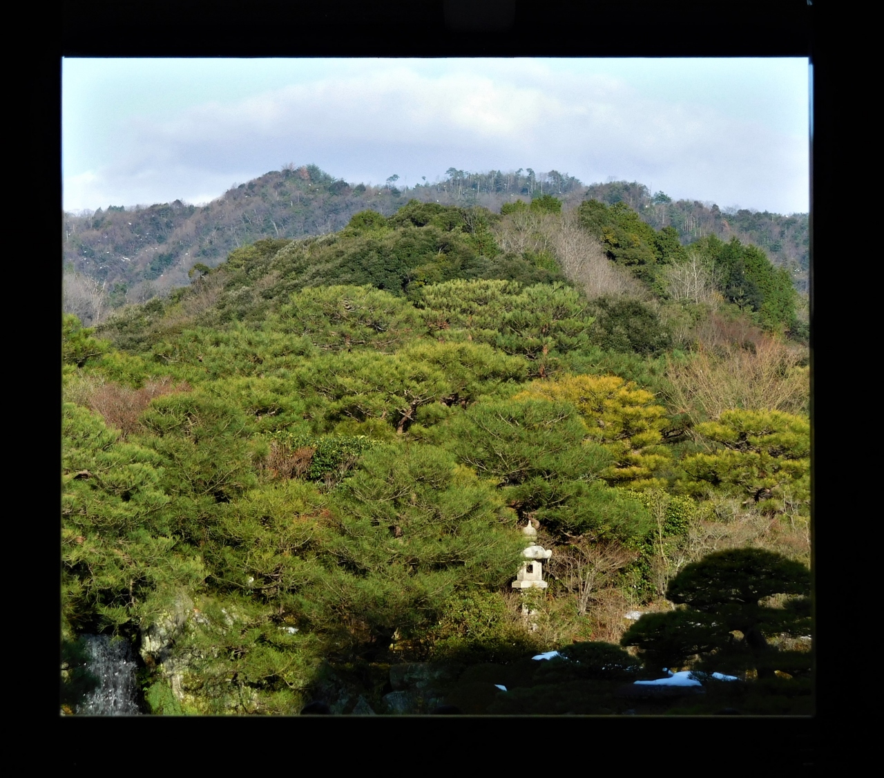 ロビーでは大きな窓ガラス越しに庭の木や石などを見られ額縁のような写真が撮れます。
