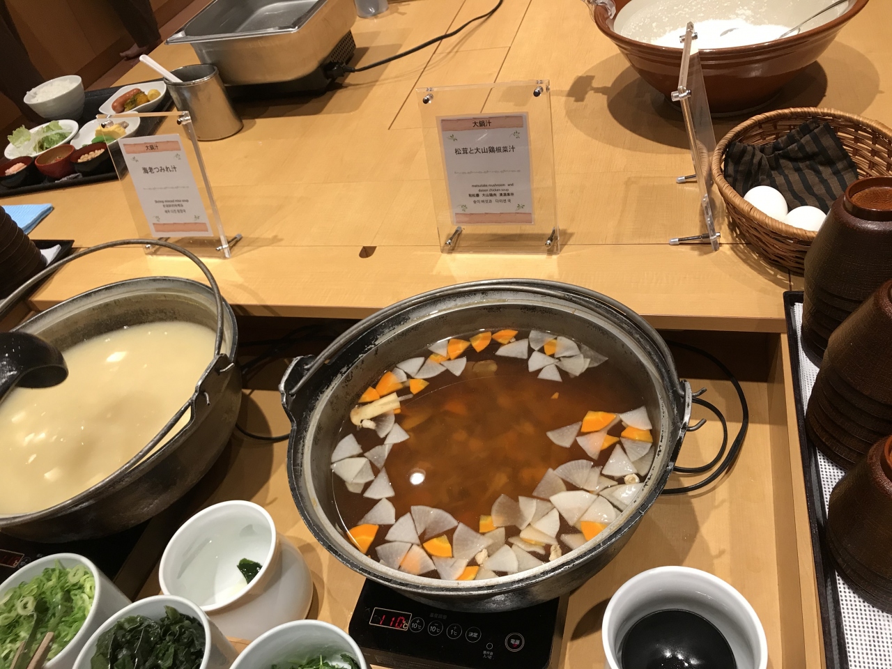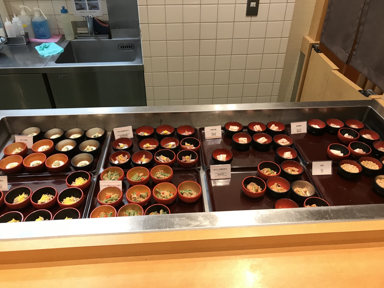 天然温泉境港夕凪の湯御宿野乃の1階です。宿泊した際に朝食を利用しました。品数が多くて、とても充実した内容でした。小鉢料理の種類も多くて、目でも楽しめました。