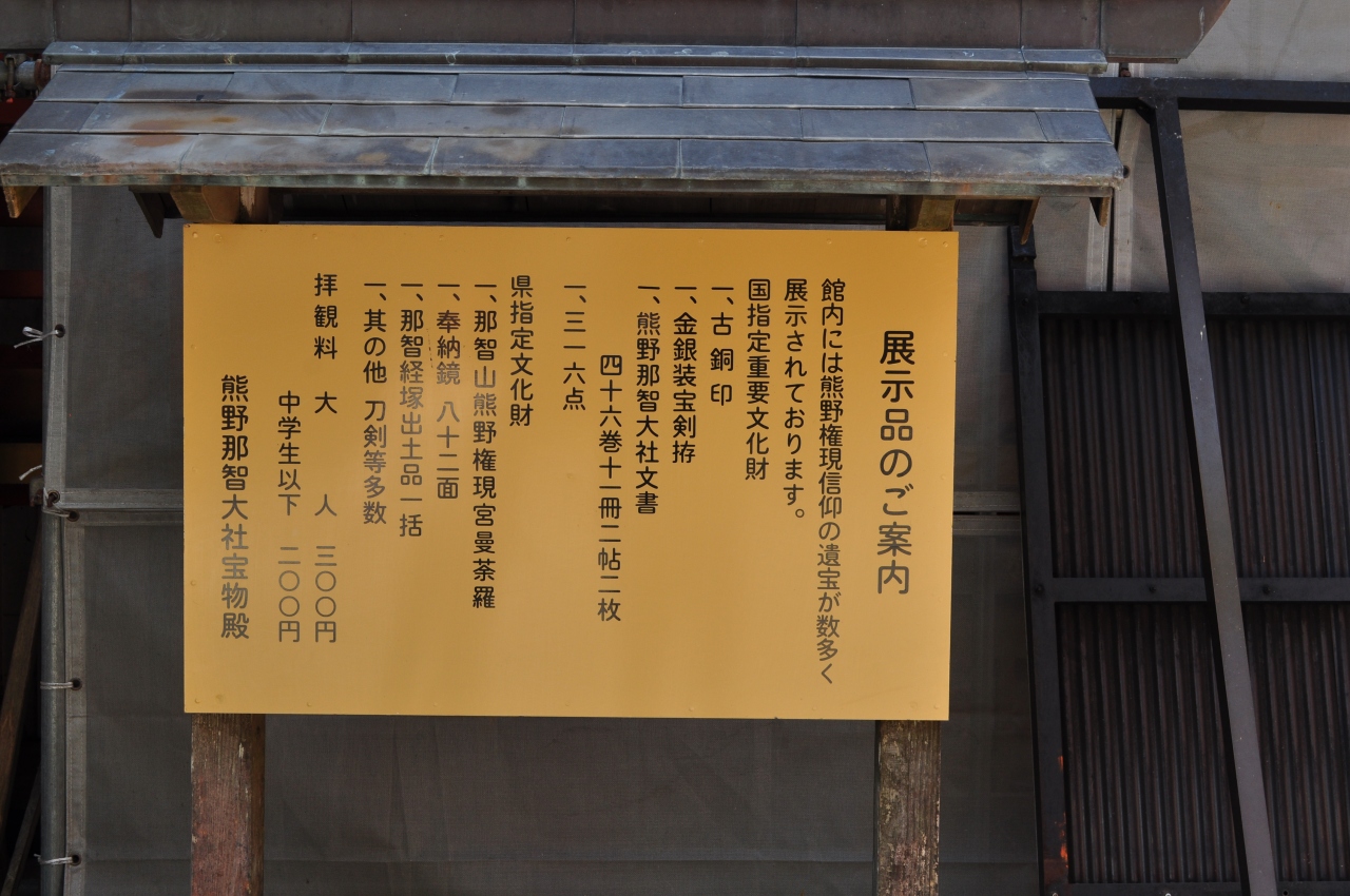 熊野三山の一つである熊野那智大社の宝物殿になります。熊野那智大社のすぐそばに建物があり、改装中でしたが内部は見学することができました。大化元年(645年)に作製された古銅印や徳川頼宣公から贈られた宝剣などの国指定重要文化財などが飾られています。それほど大きな規模の宝物殿ではありませんが、見ごたえがあって良かったです。拝観料は大人300円でした。