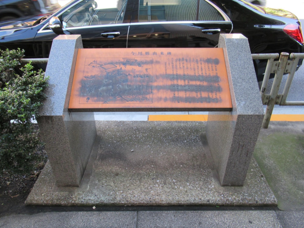 ここ 今川橋由来碑 は、JR神田駅の南東方向の中央通り (国道17号) にある室町四丁目交差点直ぐ北 (神田駅) 側をほぼ東西に続く千代田区と中央区の境界で、中央通りの西側歩道の車道側にこの由来碑があり近くに石碑と立札が、東側歩道のビル脇にも石碑があります。