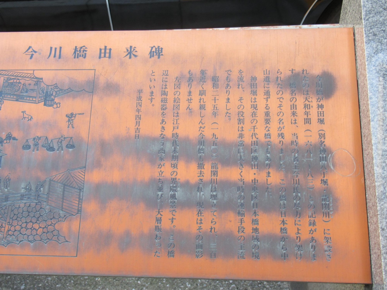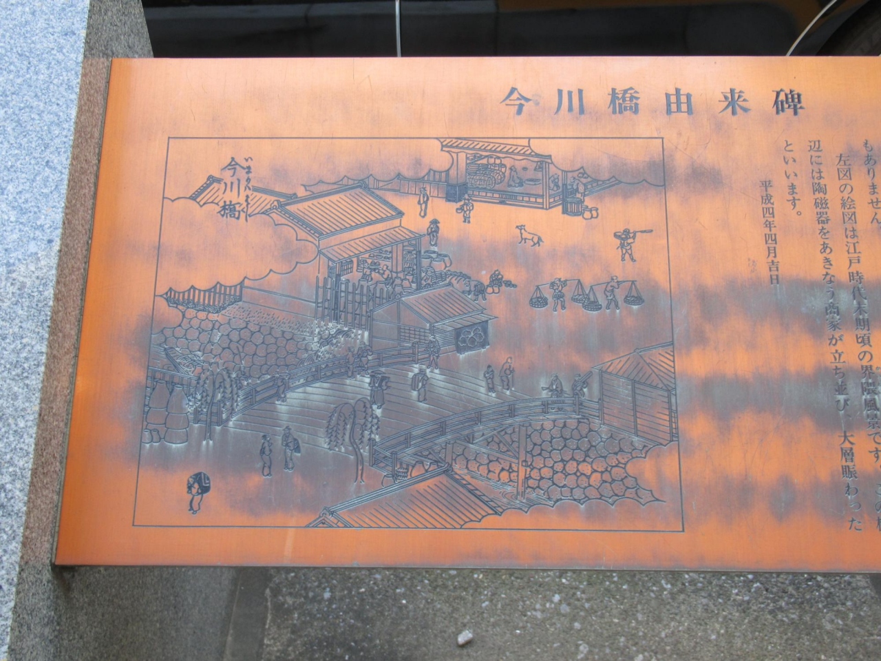 この由来碑は、銅板製で橋名の由来などとともに江戸時代末期頃の界隈風景の絵図も載っているので、当時の橋や町の様子などもいろいろ分かります。