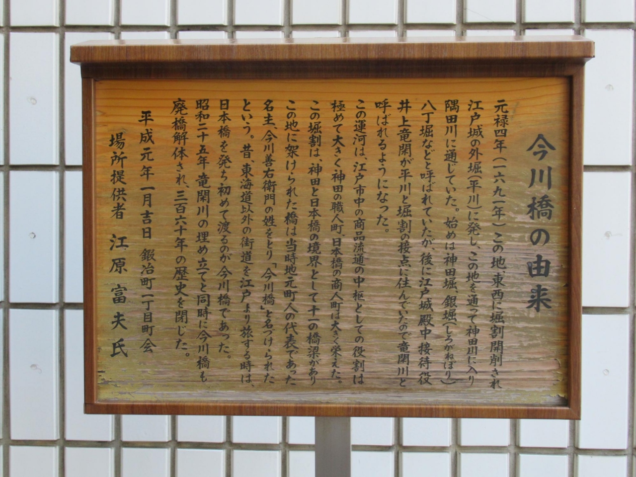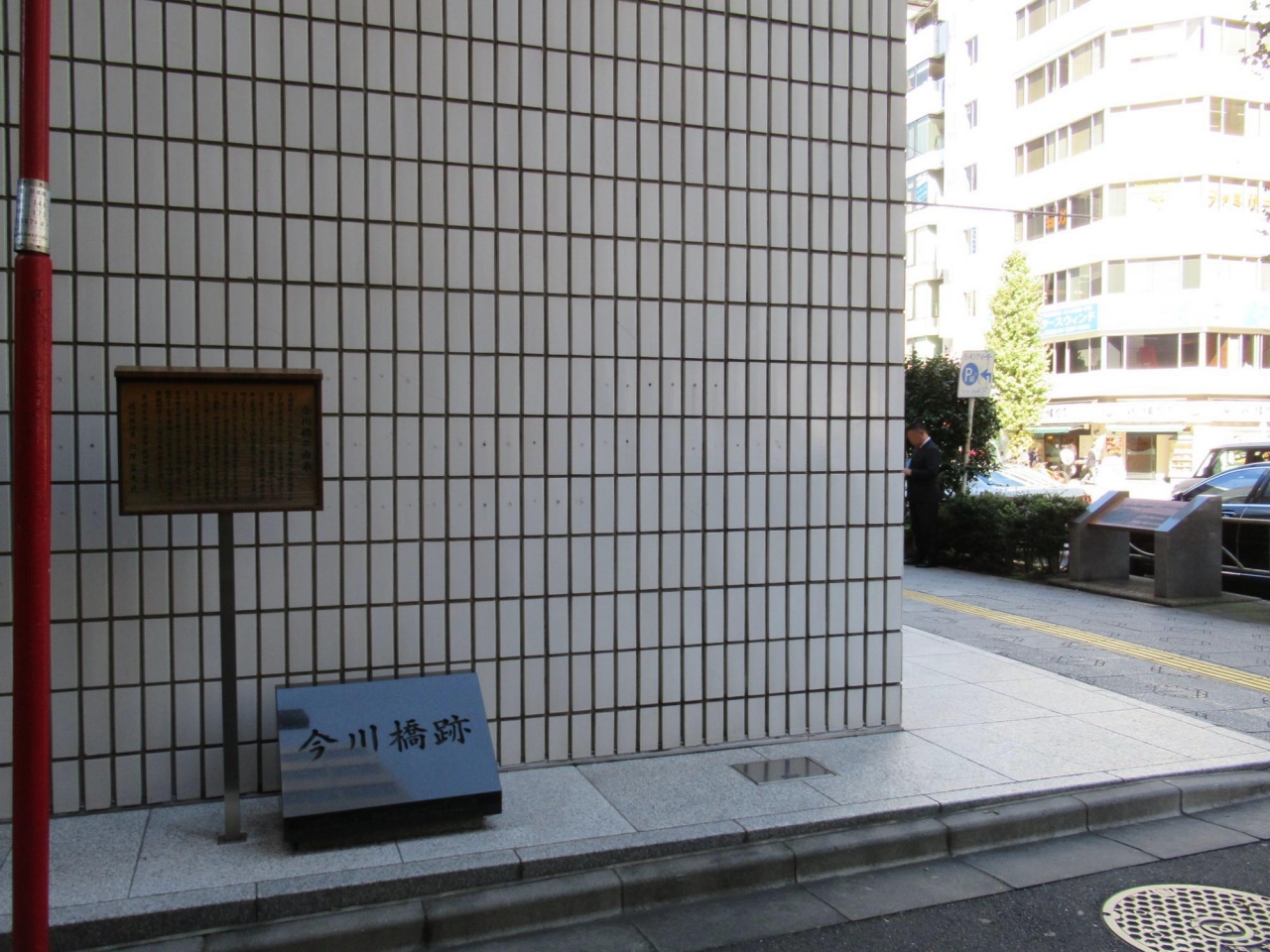 また、由来碑前の歩道側の細い通りにある石碑には「今川橋跡」と彫られ、立札には「今川橋の由来」としてほぼ東西に掘割開削された神田堀などについて詳しく記されているので、由来碑と併せてこの石碑と立札も御覧ななることをお勧めします。